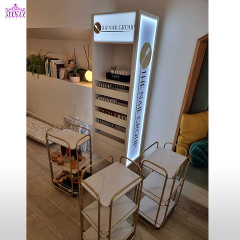 ชั้นวางทำเล็บสีขาวแบบมีไฟ LED ชั้นวางทำเล็บเฟอร์นิเจอร์ร้านเสริมสวย