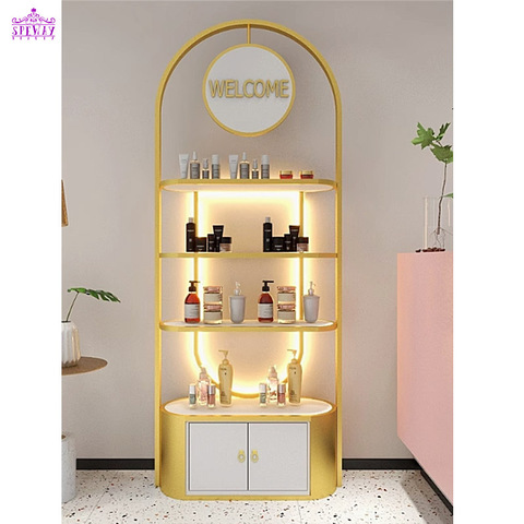 ชั้นวางของไม้พร้อมไฟ LED สำหรับร้านตัดผมร้านทำจากเหล็กสีทอง